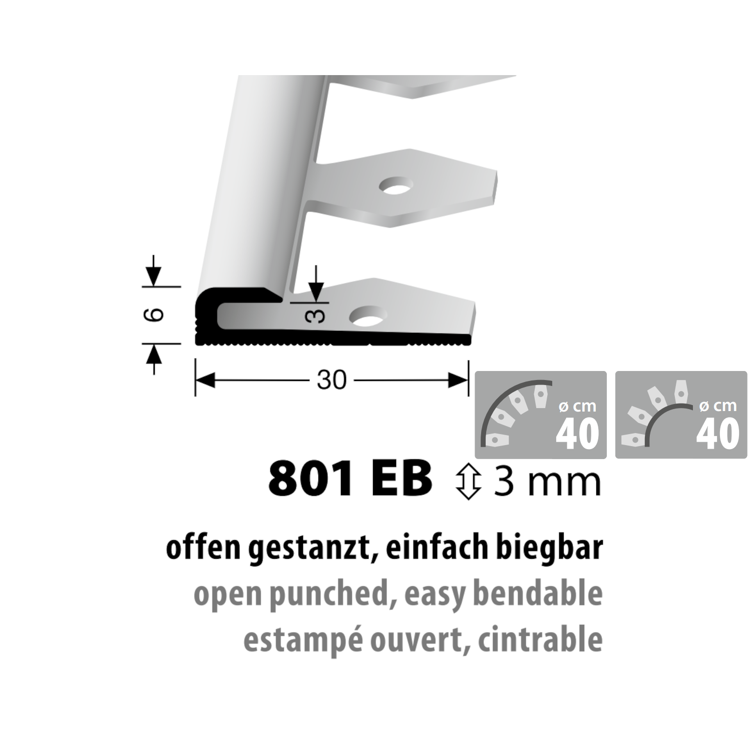 Küberit Alu Biegbares Einfassprofil Typ 801 EB, 3 mm, 250 cm, silber (F4)